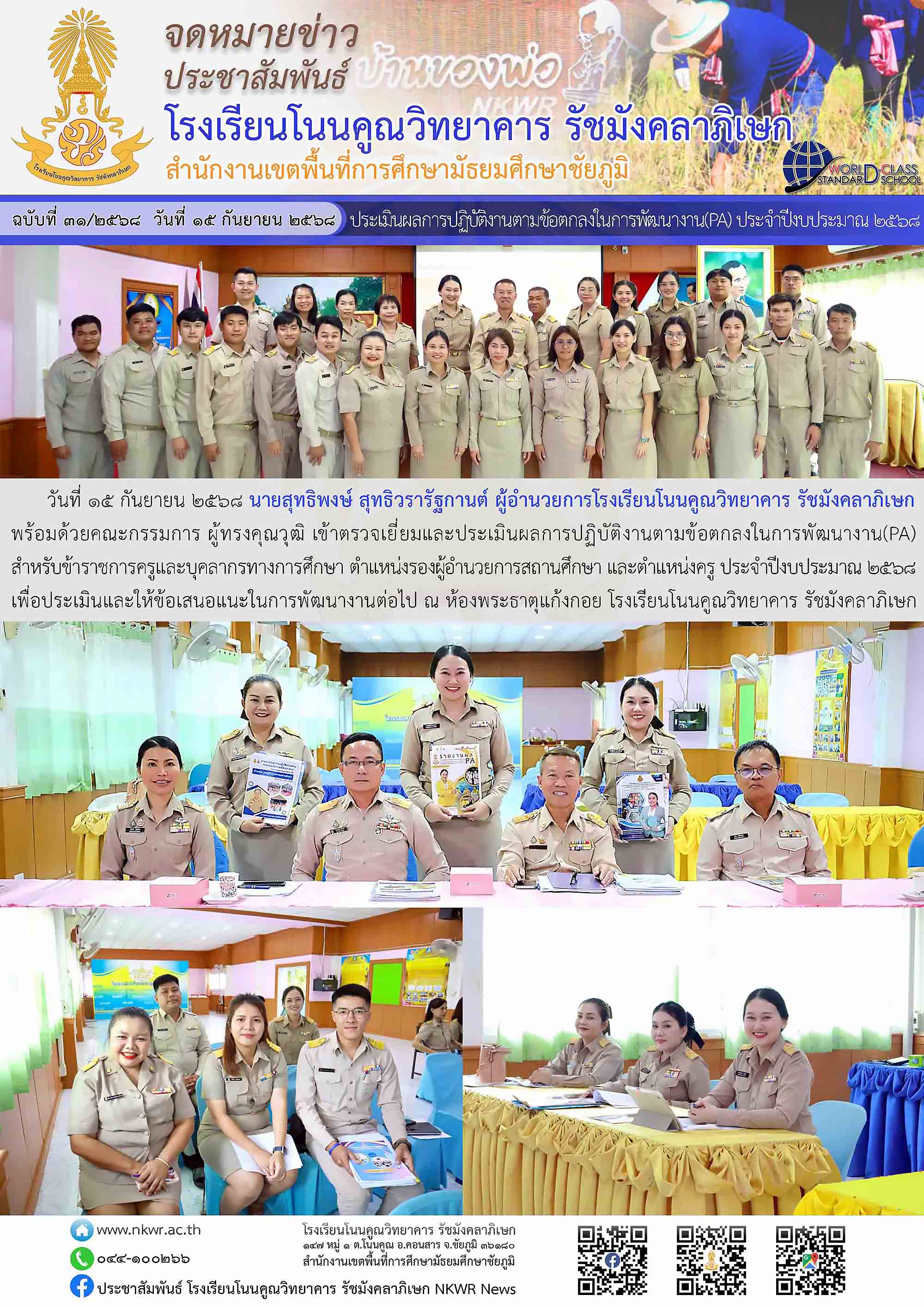 วันที่ ๑๕ กันยายน ๒๕๖๘ นายสุทธิพงษ์ สุทธิวรารัฐกานต์ ผู้อำนวยการโรงเรียนโนนคูณวิทยาคาร รัชมังคลาภิเษก พร้อมด้วยคณะกรรมการ ผู้ทรงคุณวุฒิ เข้าตรวจเยี่ยมและประเมินผลการปฏิบัติงานตามข้อตกลงในการพัฒนางาน(PA) สำหรับข้าราชการครูและบุคลากรทางการศึกษา ตำแหน่งรองผู้อำนวยการสถานศึกษา และตำแหน่งครู ประจำปีงบประมาณ ๒๕๖๘ เพื่อประเมินและให้ข้อเสนอแนะในการพัฒนางานต่อไป ณ ห้องพระธาตุแก้งกอย โรงเรียนโนนคูณวิทยาคาร รัชมังคลาภิเษก |