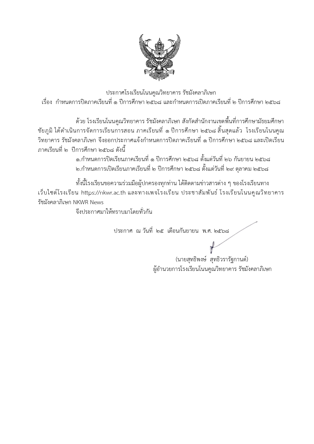 ประกาศโรงเรียนโนนคูณวิทยาคาร รัชมังคลาภิเษก -วันปิดภาคเรียนที่ 1 ปีการศึกษา 2568 -วันเปิดภาคเรียนที่ 2 ปีการศึกษา 2568